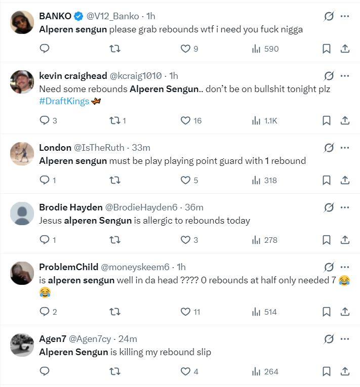 质疑NBA的球迷也有:1.NBA这是被操纵了吗?一个中锋打了半场没有篮板球?