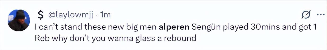 北京时间1月24日,火箭以111-104复仇活塞。这场比赛火箭队的先发中锋阿尔佩伦-申京延续了他对阵费城的低迷状态,此役他的拉胯更盛,火箭球迷们对他已经忍无可忍在社媒上各种炮轰,全都是因为申京作为一名6尺11(2.11米)的中锋只有1个篮板。