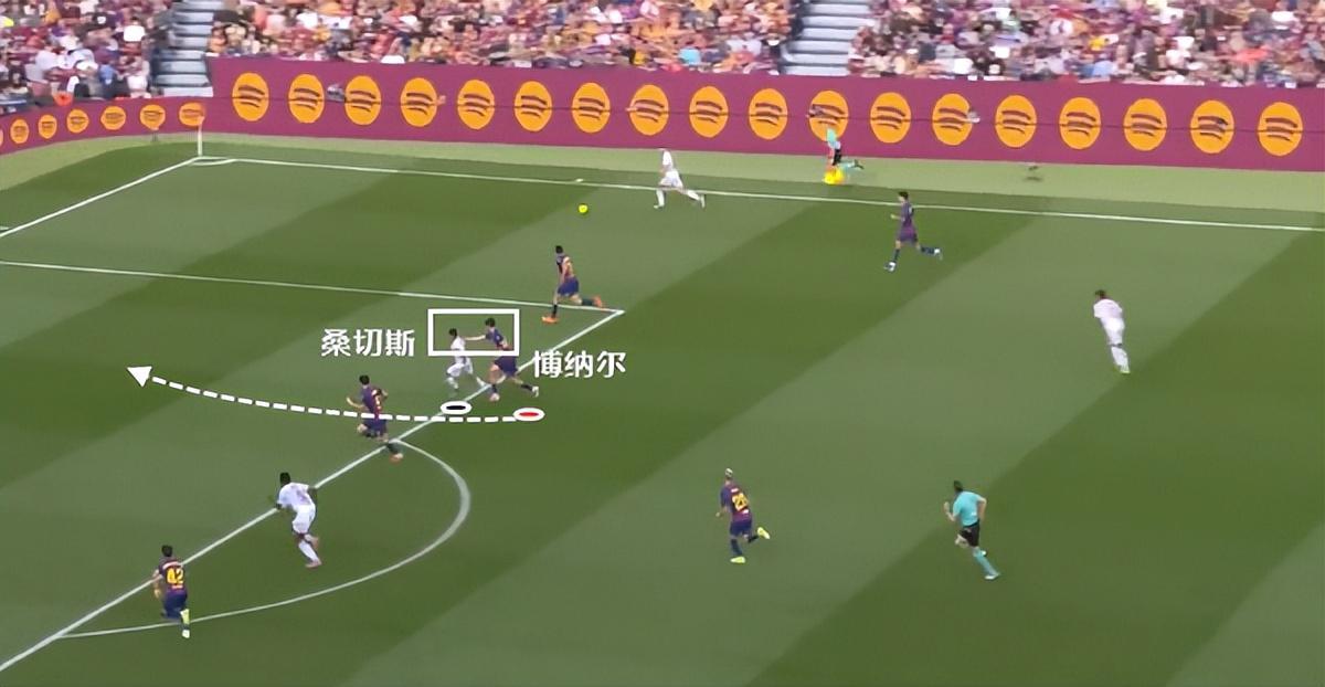 不只是进攻端,博纳尔最大的卖点是他在防守端同样能沉底中卫。这一次看到塞维利亚球员桑切斯前插,博纳尔先拉一把,随后卡住身位,去到对方身前,保护住禁区,这也是博纳尔最让人喜欢的地方之一。